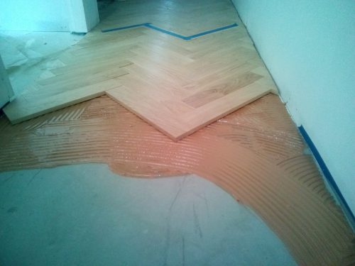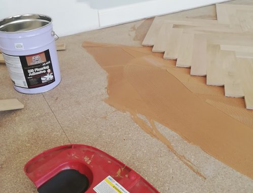 3. Place the wood in the adhesive within working time. Position it and press down or tamp down with a rubber hammer to ensure good contact. Wood may move at first. To be sure to secure the initial row to limit movement and holding patterns.